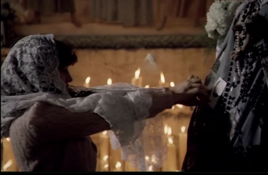 「子どもを授けてくれー」て信者が祈るシーンで、マリア像の腹をひらくと飛び出す小鳩のシーン。