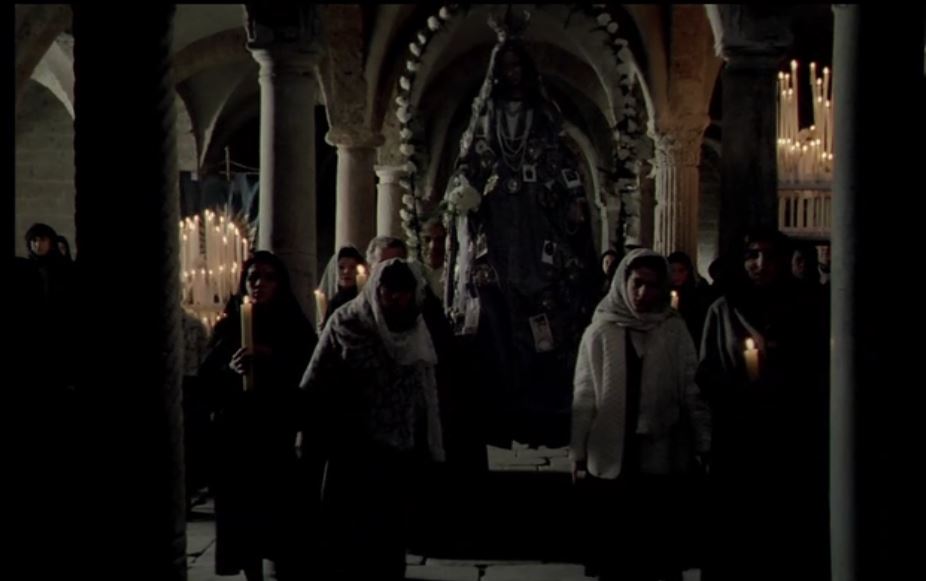 「子どもを授けてくれー」て信者が祈るシーンで、マリア像の腹をひらくと飛び出す小鳩のシーン。
